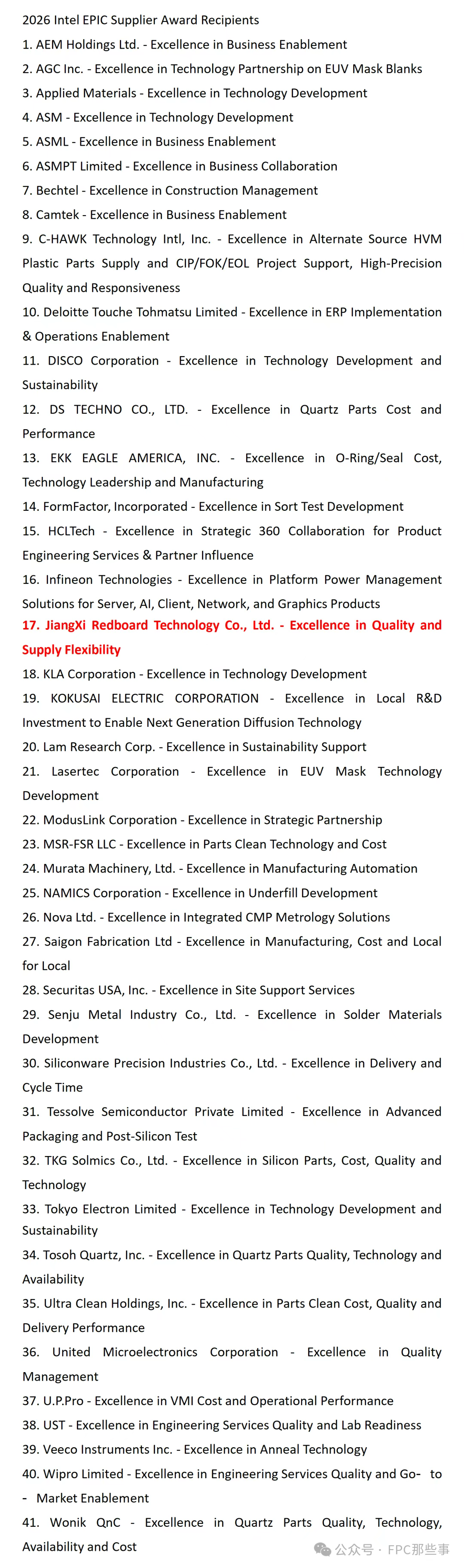 2026年英特尔EPIC供应商获奖明细