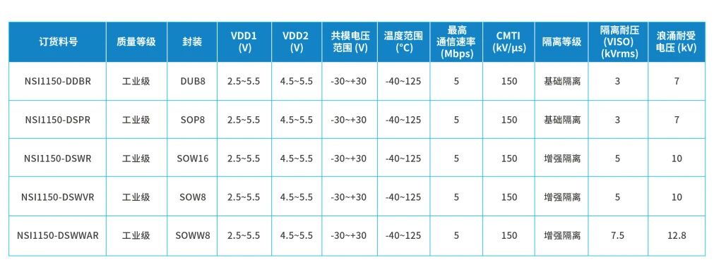 NSI1150支持SOW16SOW8SOP8SOWW8DUB8等多种封装,满足用户的多样化设计需要,可广泛适用于工业自动化与控制、能源电力、通信与服务器等高电压、强干扰、多节点的应用场景。