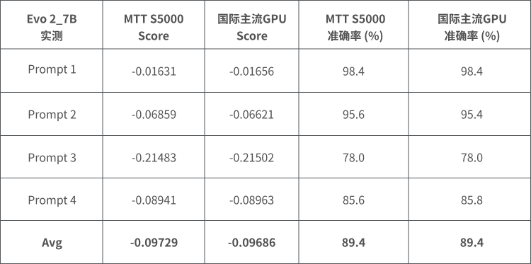 在Evo 2_7B模型上,摩尔线程完成了推理与训练的精度对标。对4个序列生成任务的比对显示:序列生成Score、准确率与国际主流GPU持平,充分体现了MUSA软件栈对基因组大模型的完整兼容性。