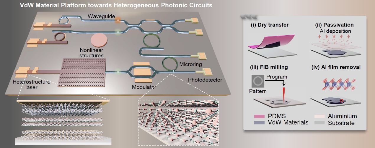 图1 基于范德瓦尔斯材料的片上异质光路概念图及其通用纳米加工流程示意图