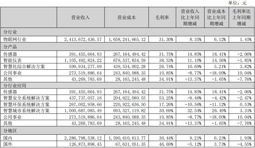 在主营业务方面,公司以传感器为核心,深度融合传感技术、智能仪表技术、数据采集技术、地理信息技术、大数据、云计算和人工智能等智慧化技术,形成了“传感器+监测终端+数据采集+空间信息技术+大数据+云应用+AI”的一体化系统解决方案。报告期内,传感器业务实现收入39,145.57万元,同比增长14.85%;智能仪表业务实现收入110,549.28万元,同比增长11.10%;智慧化综合解决方案业务实现收入59,993.43万元,同比增长10.69%。传感器生产量较上年同期增长38.02%,主要系湿度、激光等类型传感器产量增加所致。