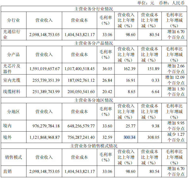公司表示,业绩大幅增长主要受人工智能发展驱动,数通市场快速增长,公司产品竞争优势凸显,客户认可度提高。光芯片及器件、室内光缆、线缆高分子材料的产品订单较上年同期实现不同程度增长。其中,光芯片及器件产品收入15.91亿元,同比增长162.39%。同时,公司持续提高运营管控能力,加强降本增效工作,提高产品良率,盈利能力显著提高。
