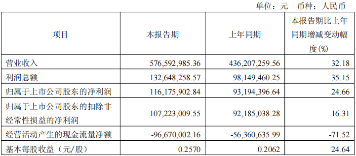 同日发布的2026年第一季度报告显示,公司一季度实现营业收入5.77亿元,同比增长32.18%;归属于上市公司股东的净利润为1.16亿元,同比增长24.66%;扣除非经常性损益后的净利润为1.07亿元,同比增长16.31%。基本每股收益为0.2570元。