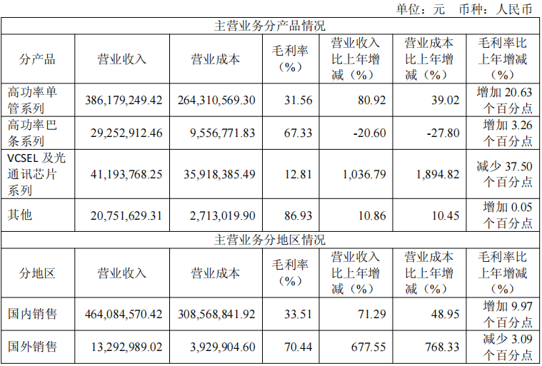 在主营业务方面,公司聚焦半导体激光领域,主要产品包括高功率单管系列产品、高功率巴条系列产品、高效率VCSEL系列产品及光通信芯片系列产品等。报告期内,高功率单管系列收入3.86亿元,同比增长80.92%,毛利率31.56%,同比增加20.63个百分点;VCSEL及光通讯芯片系列收入4,119.38万元,同比增长1,036.79%。公司已形成VCSEL、DFB、EML、PIN四大类光通信芯片产品矩阵,可满足超大容量的数据通信需求。
