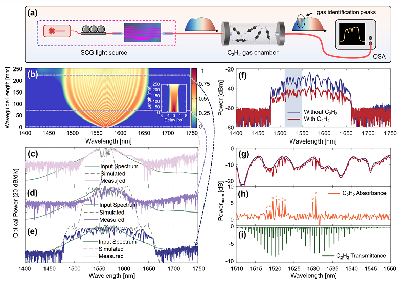 图5 超连续谱生成(SCG)和乙炔气体光谱检测实验。(a)实验装置;(b)不同波导长度下的仿真SCG谱;(c-e)不同波导长度下的输入、模拟与实测SCG光谱对比;(f)通过波导前后乙炔气体吸收的SCG谱对比;(g-i)乙炔气体吸收与透射光谱的归一化结果、乙炔气体参考透射光谱