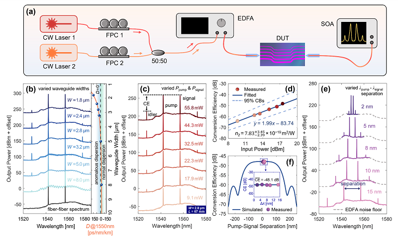 图4 不同波导宽度和波长分离下的四波混频实验结果。(a)采用两束可调激光源和光纤偏振控制器的实验装置;(b-e)不同波导宽度和波长分离对四波混频转换效率的影响,波导宽度的变化显著影响色散特性,2.8 μm宽的波导实现了最佳转换效率(−47.9 dB)