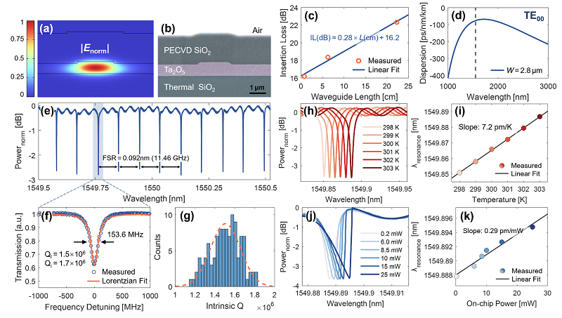 图2浅刻蚀Ta2O5脊形波导的特性,包含电场分布、波导的横截面SEM图像、波导长度与插入损耗的关系、TE00模式的色散特性、微环谐振器的传输谱、微环谐振器的谐振曲线与Lorentzian拟合、微环谐振器的本征品质因子分布等。提取的温度依赖波长偏移(TDWS)为7.2 pm/K,提取的功率依赖波长偏移(PDWS)为0.29 pm/mW