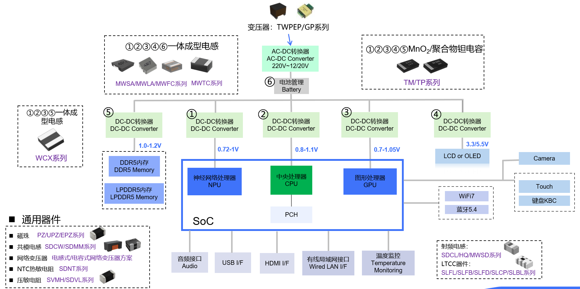 在AI PC的供电架构中,功率电感扮演着不可替代的关键角色。作为供电模块的核心组件,它主要负责向GPU、CPU、NPU等高性能芯片提供前端供电,通过电磁感应原理储存和释放能量,起到储能、滤波等作用,确保芯片获得稳定电源。形象地说,电感就是AI PC供电系统中的精准能源调控中心,为整个系统的稳定运行提供坚实的电力支持。