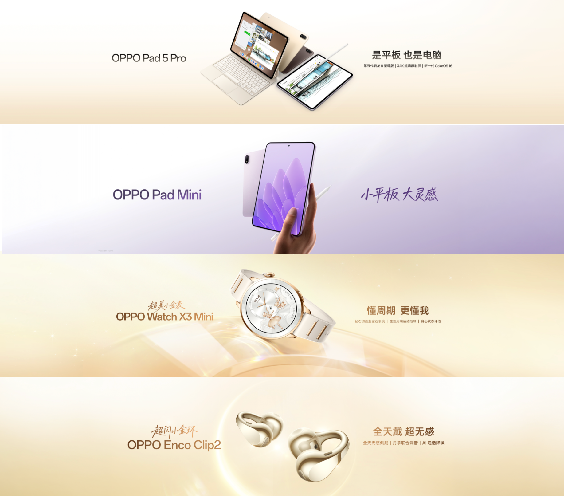 进入2026年,OPPO进一步加码生态布局。Pad 5 Pro延续生产力与影音体验优势;Watch X3 mini成为行业首款专为女性生理周期与减脂场景定制的智能手表;Watch X3延续“安卓表皇”定位,线下渠道同比增长120%;Enco Clip2耳夹式耳机主打全天候舒适佩戴;而Pad mini的推出则补齐了小尺寸平板在轻度生产力与娱乐场景的空白。