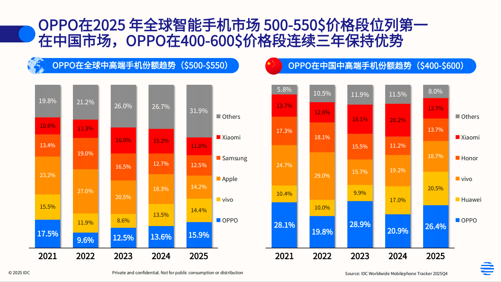 据IDC数据,2025年OPPO在全球500–550美元价位段稳居第一,以284美元的平均售价位列全球第三。更关键的是,海外市场对OPPO的品牌认知正从“高性价比”转向“高端可靠”。Ultra系列的出海,不仅提升了高端机型占比,也标志着OPPO在全球高端智能手机市场完成了从产品输出到品牌输出的跃迁。