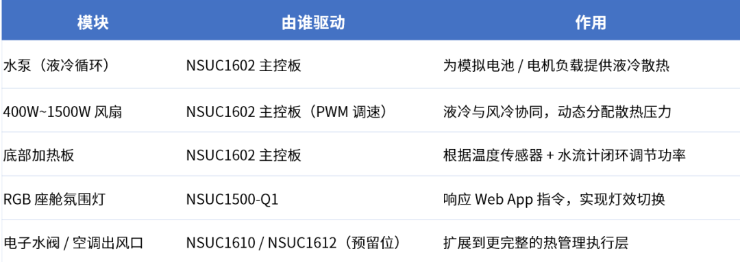 这是一套基于纳芯微NSUC1602NSUC1610 打造的汽车热管理动态Demo,核心是一块基于 NSUC1602 的主控板,它在系统里的角色不是"单纯的 MCU",而是担负着热管理 ECU的角色: