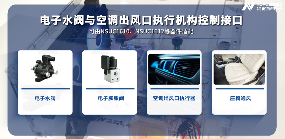 12V 直挂的执行器(电子水阀 / 风门 / 鼓风机 / 座椅通风) → NSUC1610 / 1612 的的单芯片直驱方案可作为基准设计,尤其 NSUC1612 的低功耗休眠对暗电流敏感的项目友好;