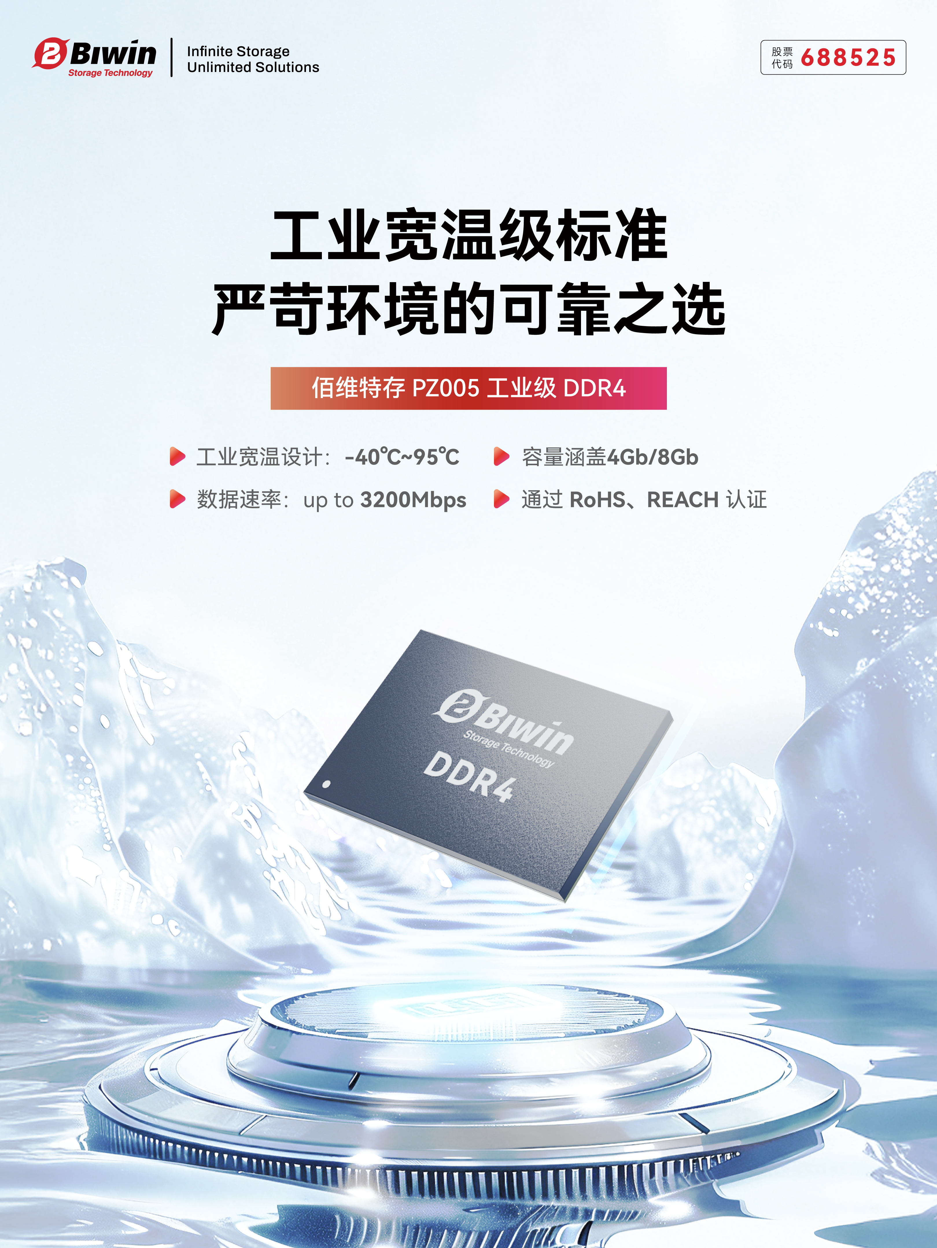 佰维DDR PZ005采用工业级DRAM,数据速率最高可达3200Mbps,支持-40℃至95℃的宽温域稳定运行,并已通过RoHS、REACH等认证。PZ005强化了抗电磁干扰设计,能够在复杂电力环境等强干扰场景中保持稳定的读写性能与数据传输安全,满足中间数据缓存等实时应用对高速、稳定数据交换的需求。