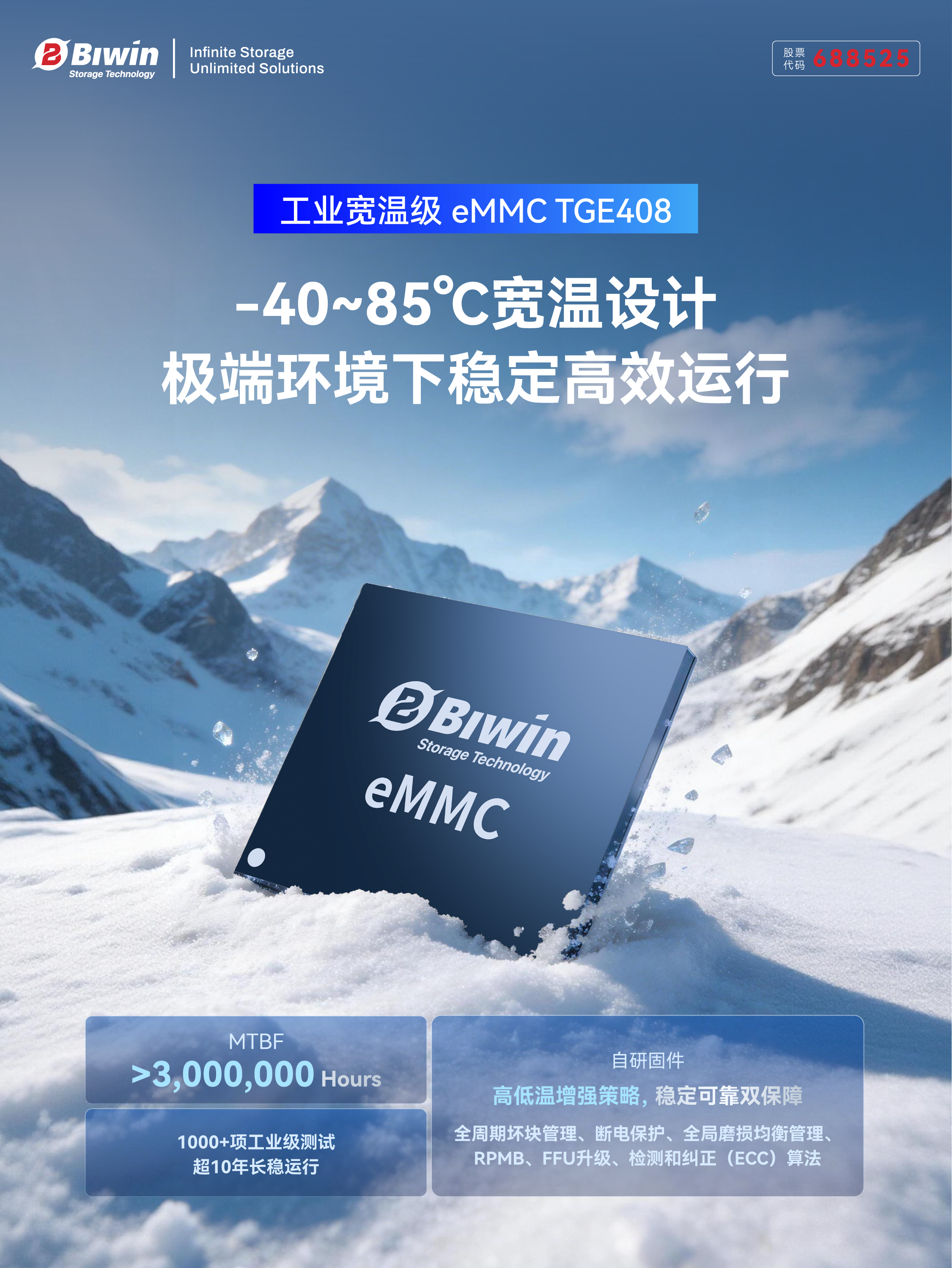 佰维工业宽温eMMC TGE408搭载佰维自研主控与本土高品质闪存,支持-40℃至85℃的超宽工作温域,8GB至128GB容量灵活适配,具备抗电磁干扰能力,可从容应对户外极端温度、电源波动及复杂电磁环境等严苛工况。