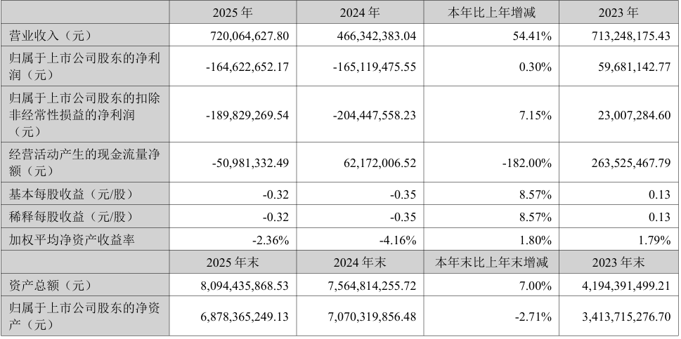 4月24日,长沙景嘉微电子股份有限公司正式发布2025年年度报告。年报显示,2025年景嘉微实现营业总收入7.2亿元,同比增长54.41%;归属于上市公司股东的净利润-1.65亿元,同比减亏0.3%;归属于上市公司股东的扣除非经常性损益的净利润-1.9亿元,同比减亏7.15%。