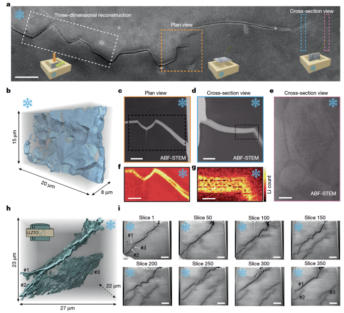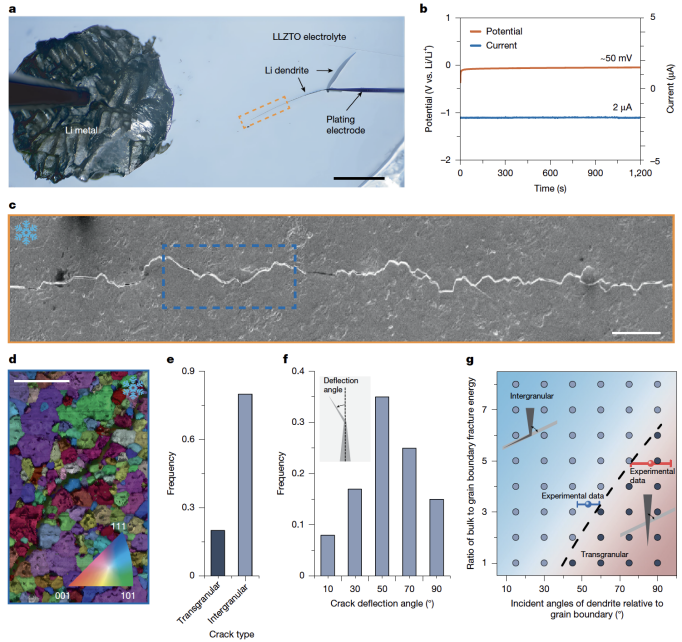 研究团队发展了可精确定位锂枝晶尖端位置的平面型电池装置,开发了基于原位工况光镜、冷冻扫描电镜、冷冻透射电镜及电子能量损失谱的辐照敏感材料先进表征技术,研究了纳米、微米和宏观尺度下固态电解质中锂枝晶的生长行为以及多场耦合下固态电池的失效机制。发现锂枝晶生长宏观上呈近似直线扩展行为,而在微观尺度上表现为穿晶和沿晶混合断裂模式,其中约20%为穿晶断裂,说明锂枝晶的生长并非源于晶界处锂的孤立还原析出和互连。此外,近75% 的沿晶裂纹偏转角超过40°,表明即使较大的裂纹偏转可显著降低枝晶尖端的最大拉应力,锂枝晶仍倾向于沿晶界连续生长。