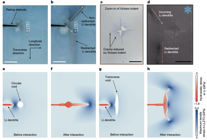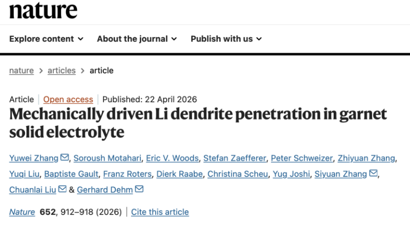 北京时间2026年4月23日,上海交通大学材料学院轻合金精密成型国家工程研究中心丁文江院士团队董杰教授课题组刘传来副教授在国际顶尖学术期刊《自然》(Nature)在线发表题为 “Mechanically driven Li dendrite penetration in garnet solid electrolyte” 的研究论文。该研究针对全固态锂金属电池中枝晶生长导致电池短路失效的难题,首次从纳米到微米尺度揭示了锂枝晶在固态电解质中的应力驱动生长机制,提出通过微孔洞等结构缺陷定向调控枝晶生长路径,大幅提升了固态电池循环稳定性,对实现下一代高能量密度、高安全、长寿命全固态锂电池具有重要的指导意义。