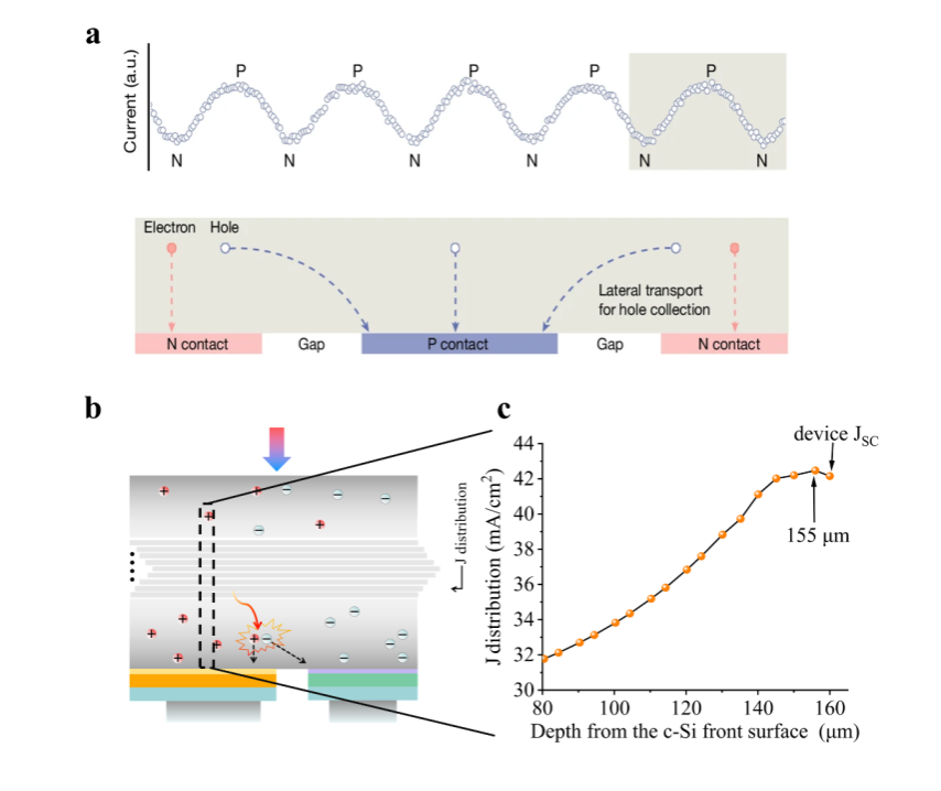 新型高效晶硅电池融合了隧穿氧化层钝化接触(TOPCon)电池与硅异质结(SHJ)电池的技术优势,并成功集成到叉指背接触(IBC)的太阳电池架构中。基于电池正面的多功能材料及其结构优化,在移除前表面金属栅线的同时,采用SiOX/SiNX减反层与n-nc-SiOX/i-a-Si/i-a-SiOX钝化层的叠加,实现了优异的光学陷光与表面钝化,显著降低了光学损失和载流子表面复合;针对传统双面接触器件中光生载流子的“往返迁移”现象和传输阻塞问题,电池背面的设计采用了TOPCon衍生的含氧本征非晶氧化硅n型接触(a-SiOX+-poly-Si)与SHJ衍生的梯度硼掺杂p型接触(i-a-Si/p-a-Si)相结合的混合结构,不仅有效提升了抑制缺陷产生、钝化界面以及光生载流子的单向传输和高效收集能力,而且探明并确立了决定晶硅太阳电池有源层最佳尺寸的物理机制。