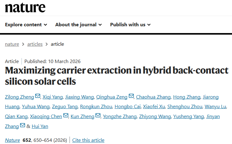 近日,北京工业大学材料科学与工程学院严辉教授团队与福建省金石能源公司张津燕博士团队合作完成的混合背接触(Hybrid Back-Contact)晶硅太阳能光伏电池研究成果,以“Maximizing carrier extraction in hybrid back-contact silicon solar cells”为题,正式发表于国际高水平学术期刊《Nature》(Vol 652, pp. 650-654)。两个团队基于长期的产教融合,通过工艺创新和理论突破,实现了电池结构的优化设计与光生载流子动力学调控,成功研制出国际权威认证效率高达27.62%的量产化高效晶硅电池,为突破当前晶硅电池效率瓶颈提供了全新的技术路线与理论支撑。