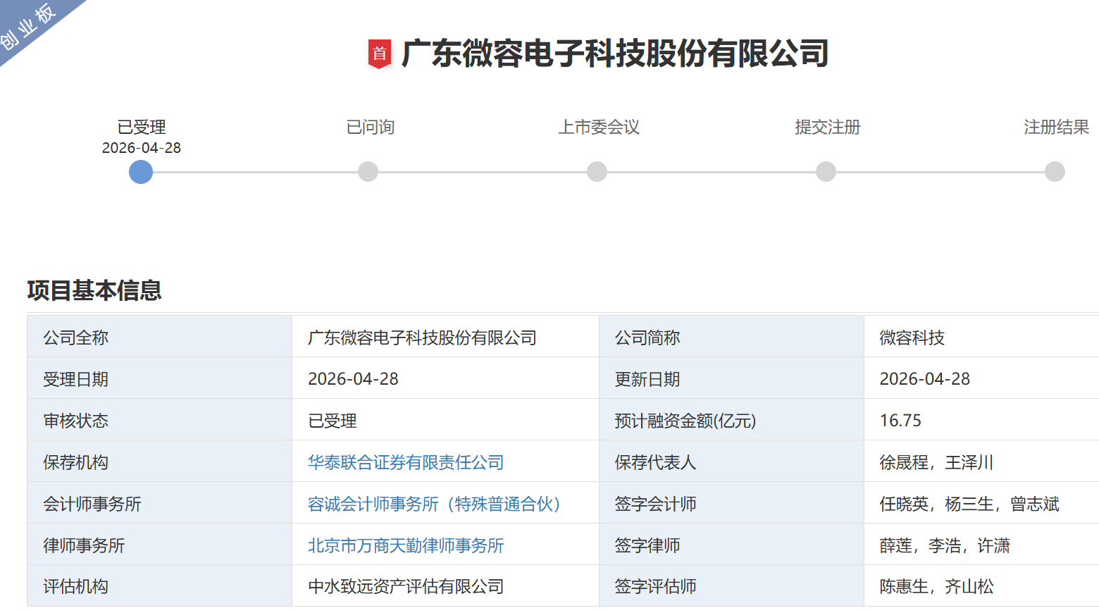 广东微容电子科技股份有限公司(简称:微容科技)创业板IPO于4月28日获受理,公司正式重启资本市场上市进程。