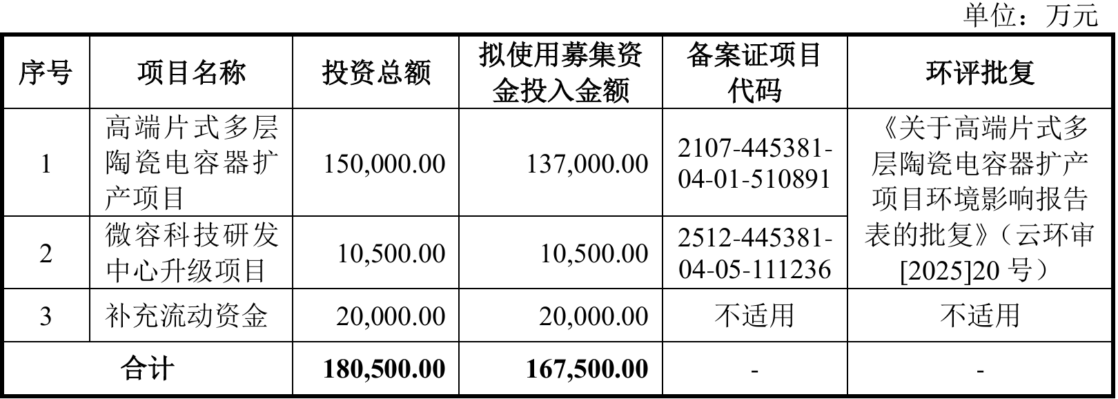 本次IPO,微容科技拟募资16.75亿元,用于高端片式多层陶瓷电容器扩产项目、微容科技研发中心升级项目以及补充流动资金。其中,高端片式多层陶瓷电容器扩产项目紧密围绕公司主营业务展开,深度契合发行人主营业务和核心技术体系,顺应下游应用领域对微型化、高容量、高可靠MLCC日益增长的需求,符合行业高端化、国产化替代的核心发展趋势,将进一步巩固和提升公司在高端MLCC领域的核心竞争力。研发中心升级项目与补充流动资金项目将有效支持公司扩大研发投入规模、增强资金实力,进而为技术创新深化与核心人才引进提供坚实保障,持续夯实公司高质量、可持续发展的核心竞争力。