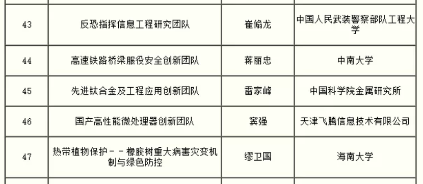 其中,在集成电路领域天津飞腾信息技术有限公司的“国产高性能微处理器创新团队”入选重点领域创新团队。
