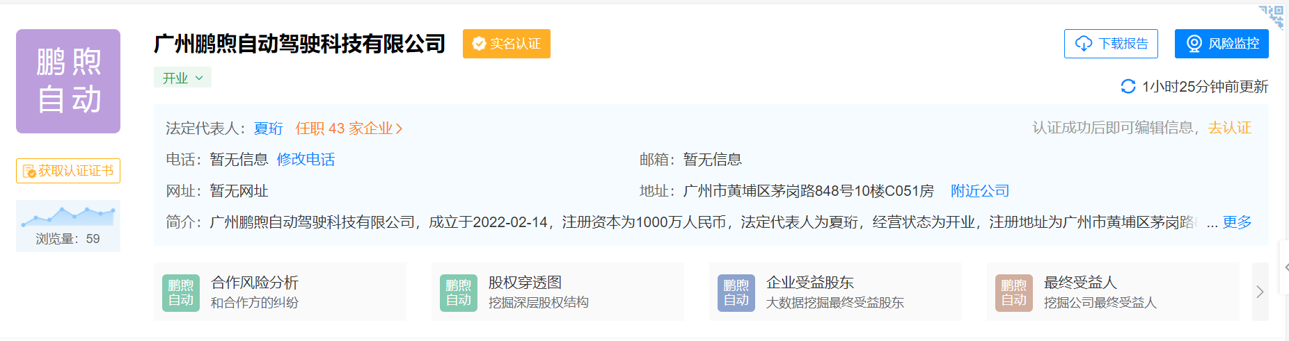 (文/吴嘉熙)近日,天眼查显示,2月14日,广州鹏煦自动驾驶科技有限公司成立,法定代表人为夏珩,注册资本1000万元人民币,经营范围包含网络技术服务;计算机系统服务;信息系统运行维护服务;物联网技术研发;物联网技术服务;物联网应用服务;物联网设备销售;智能控制系统集成;人工智能理论与算法软件开发;智能车载设备销售;网络与信息安全软件开发;人工智能应用软件开发等。