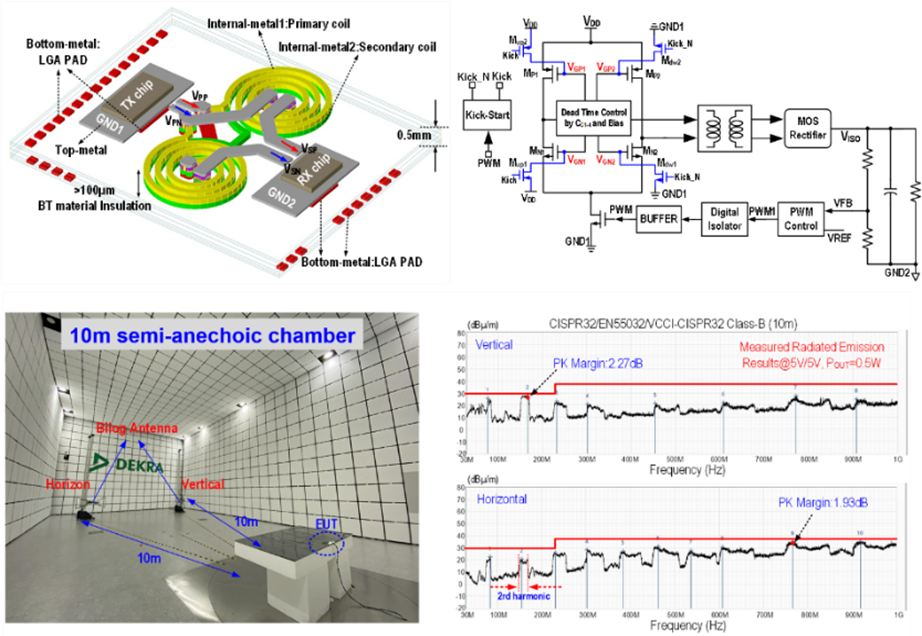 最终测试结果表明该芯片实现了51%的峰值转换效率和最大1.2W的输出功率,并且在专业的10米场暗室中实测通过了CISPR-32的B类EMI辐射国际标准,研究成果以“A 1.2W 51%-Peak-Efficiency Isolated DC-DC Converter with a Cross-Coupled Shoot-Through-Free Class-DOscillator Meeting the CISPR-32 Class-B EMI Standard”为题发表在ISSCC2022上。第一作者为中国科大微电子学院特任副研究员潘东方,程林教授为通讯作者,纳芯微电子为论文合作单位。这是课题组连续第二年在隔离电源芯片设计领域发表的ISSCC论文。