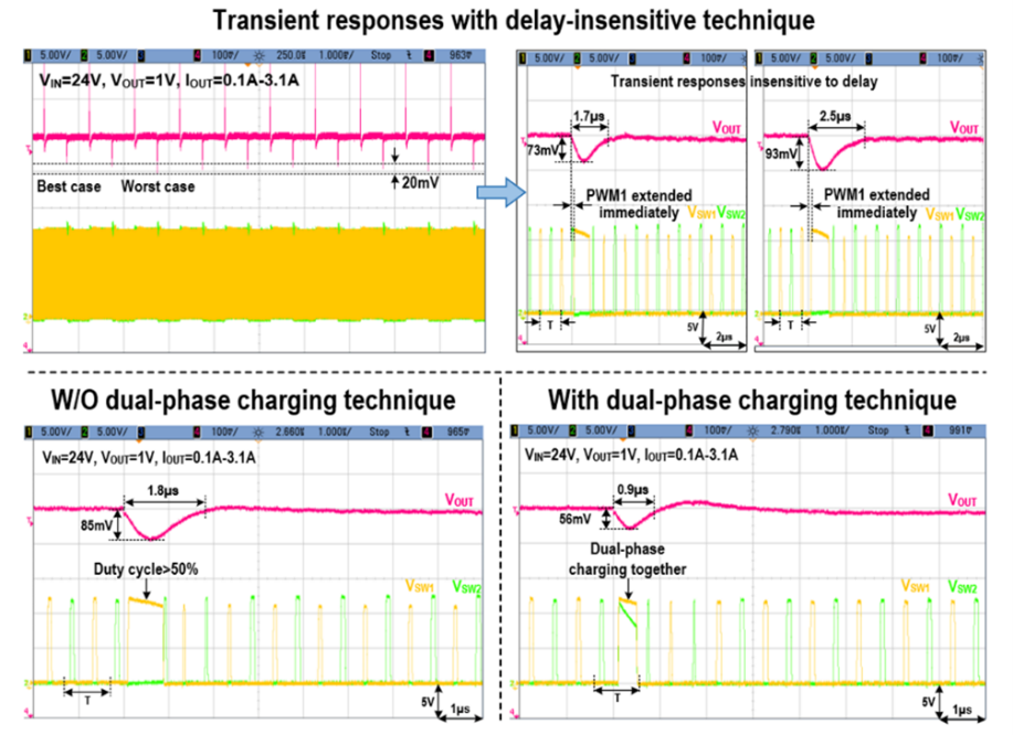 本研究基于两相串联电容式DC-DC转换器拓扑结构,提出了双反馈环路的电压模式PWM控制方法,实现对输出电压和串联电容电压的调制。同时,本研究还提出了快速瞬态响应技术,既克服传统PWM控制方法存在的环路响应速度与负载跳变时刻有关的缺点,也可以利用两相电感电流同步对负载充电以进一步提高转换器的响应速度。最终测试结果表明本研究在3A电流的负载跳变下实现了仅0.9ms的恢复时间,取得了目前同类研究中最快的负载瞬态响应速度,研究成果以“A 12V/24V-to-1V DSD Power Converter with 56mV Droop and 0.9µs 1% Settling Time for a 3A/20ns Load Transient”为题发表在ISSCC2022上。第一作者为中国科大微电子学院博士生苑竞艺,程林教授为通讯作者。