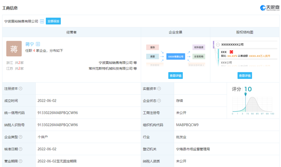 近日,宁波震裕销售有限公司成立,注册资本5000万元人民币,经营范围包含:汽车零配件批发;新能源汽车电附件销售;电池零配件销售;机械零件、零部件销售等。天眼查股权穿透显示,该公司由震裕科技100%控股。