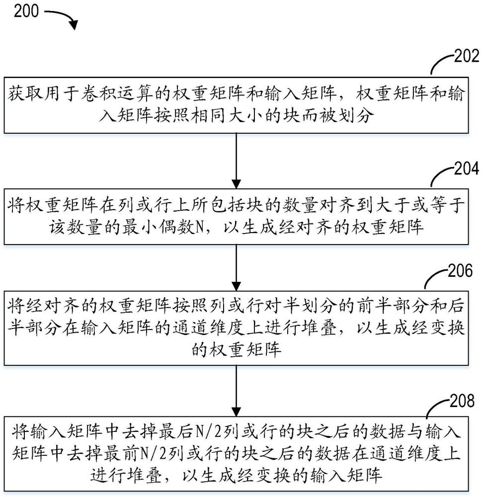 本公开提供了用于卷积运算的方法、设备和存储介质,涉及计算领域。具体方案为:获取权重矩阵和输入矩阵,权重矩阵和输入矩阵按照相同大小的块而被划分;迭代一次或多次执行以下变换操作,以用于经由矩阵计算装置执行卷积运算:将权重矩阵在列或行上所包括块的数量对齐到大于或等于数量的最小偶数N,以生成经对齐的权重矩阵;将经对齐的权重矩阵按照列或行对半划分的前半部分和后半部分在输入矩阵的通道维度上进行堆叠,以生成经变换的权重矩阵;以及将输入矩阵中去掉最后N/2列或行的块之后的数据与输入矩阵中去掉最前N/2列或行的块之后的数据在通道维度上进行堆叠,以生成经变换的输入矩阵。由此,能够提高矩阵计算装置进行卷积运算的效率。