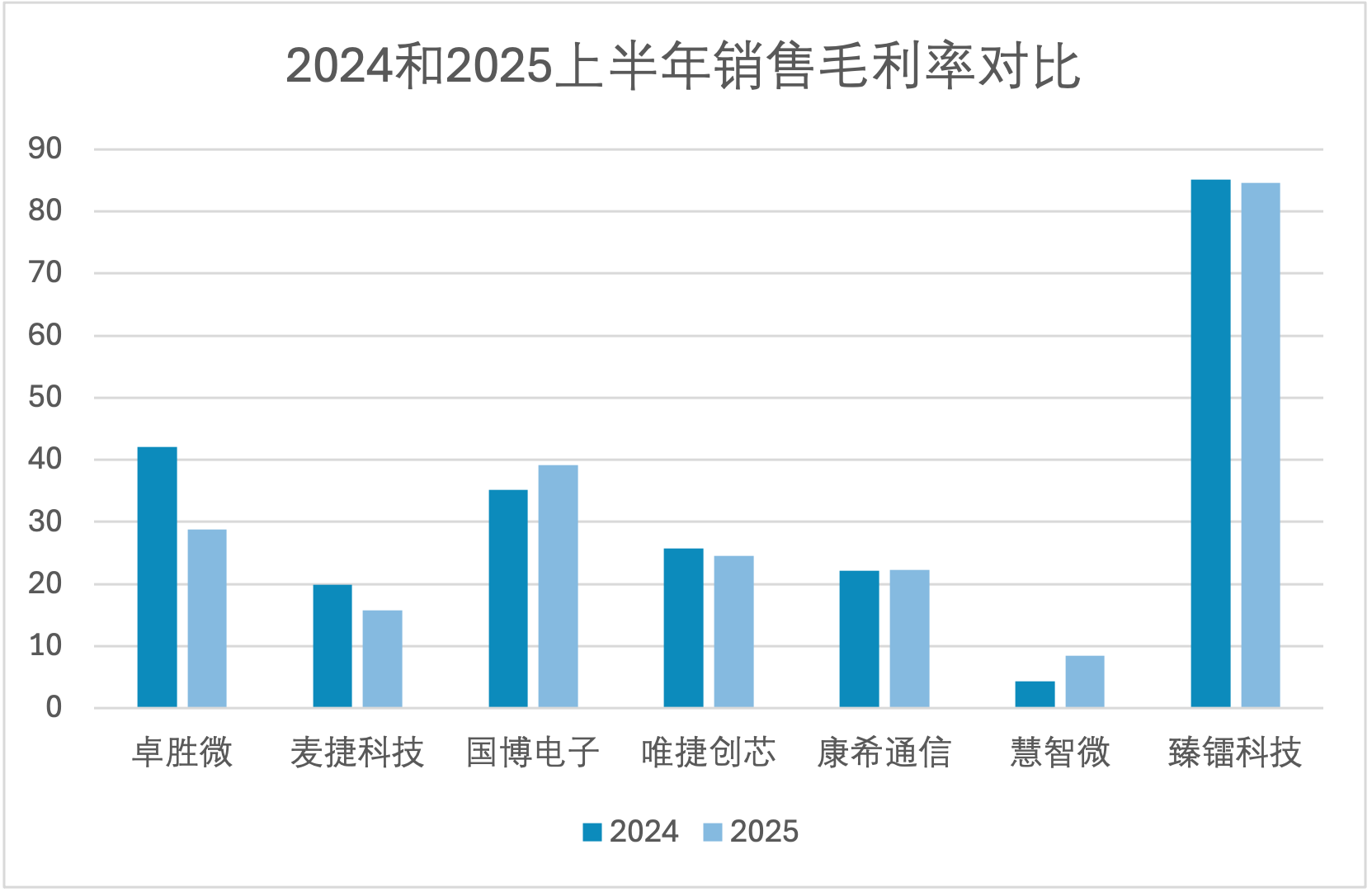 销售毛利率的变化进一步反映出企业产品结构、市场定价能力和盈利能力的变化。卓胜微毛利率从42.1%大幅下滑至28.8%,麦捷科技也出现下降。相反,国博电子毛利率提升至39.1%,慧智微几乎翻倍,臻镭科技保持在84%以上的极高水准,说明其在高端产品领域具备较强竞争力。