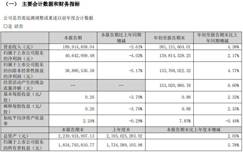 资产负债结构层面,截至报告期末,公司总资产达22.4亿元,较上年末增长2.05%;归属于上市公司股东的所有者权益18.35亿元,较上年末增长5.78%。