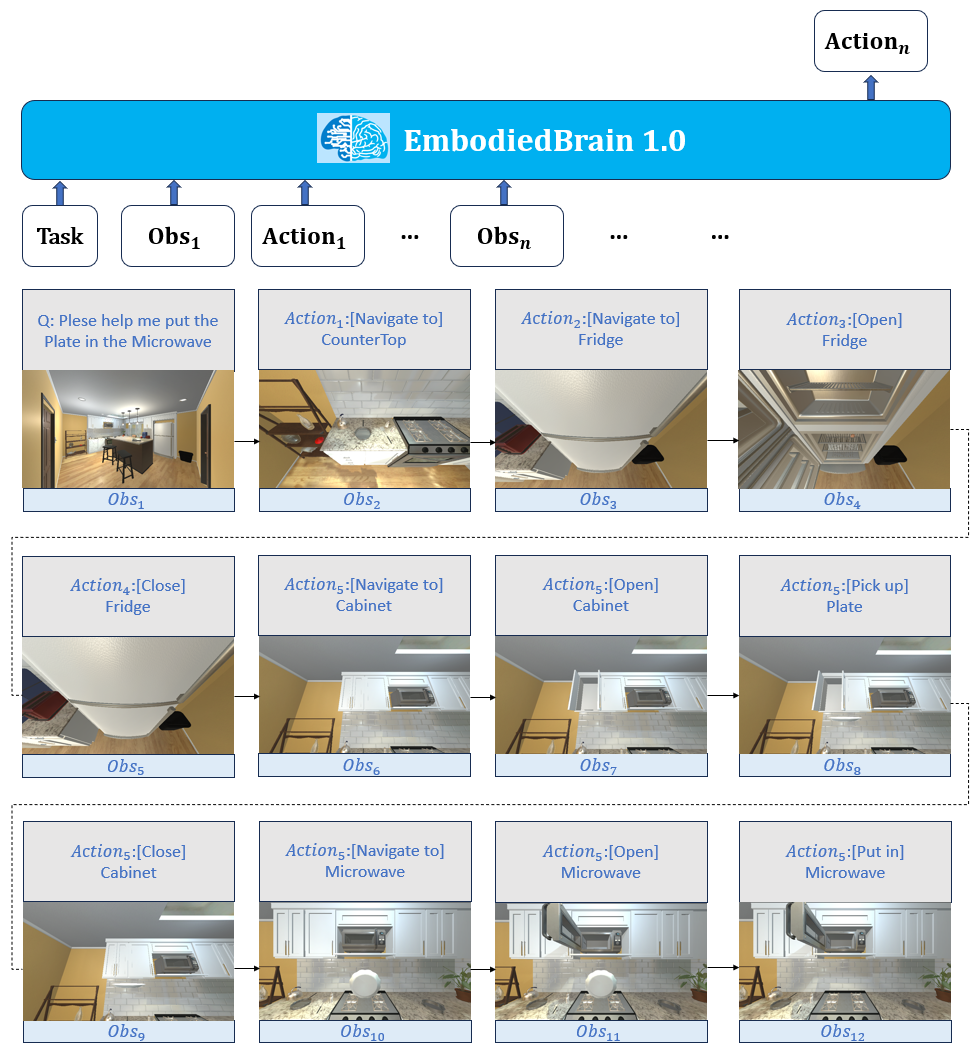 图 3EmbodiedBrain 实时规划能力展示:“在开放的厨房中找到盘子并放入微波炉”