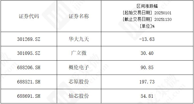2025年,EDA/IP行业股价表现整体上涨,截至11月30日,涨幅最高的公司是芯原股份(197.73 %),涨幅最低的公司是华大九天(-13.63  %)。