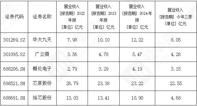 2025前三季度营业总收入从高到低为为:芯原股份(22.55 亿元)、华大九天(8.05 亿元)、灿芯股份(4.68 亿元)、广立微(4.28 亿元)、概伦电子(3.15 亿元)。