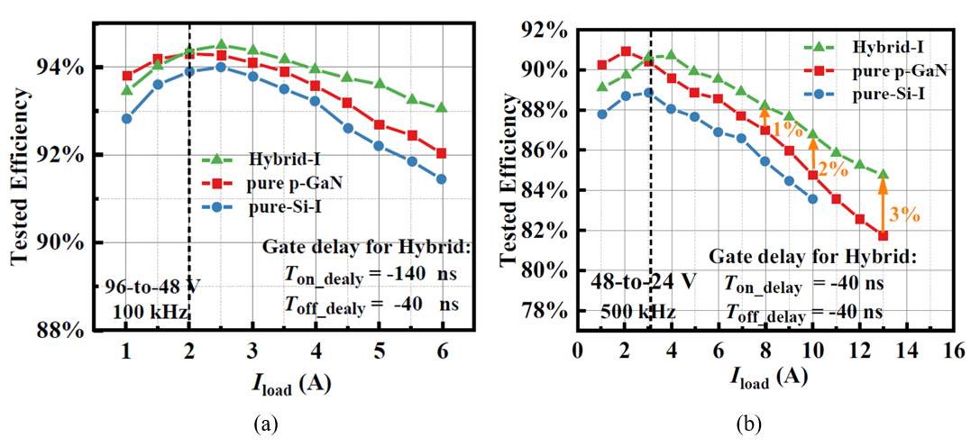 图2 采用GaN/Si混并联器件、全GaN器件和全Si器件的Buck转换器效率对比。(a) 96 -to- 48V转换器在150 kHz的效率对比。(b) 48-to- 24V转换器在500 kHz的效率对比。