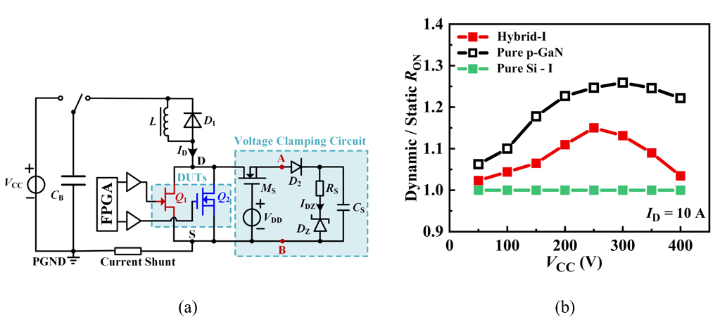 图1 (a) 器件级动态导通电阻表征实验装置电路图。(b) VCC对器件动态导通电阻的影响。