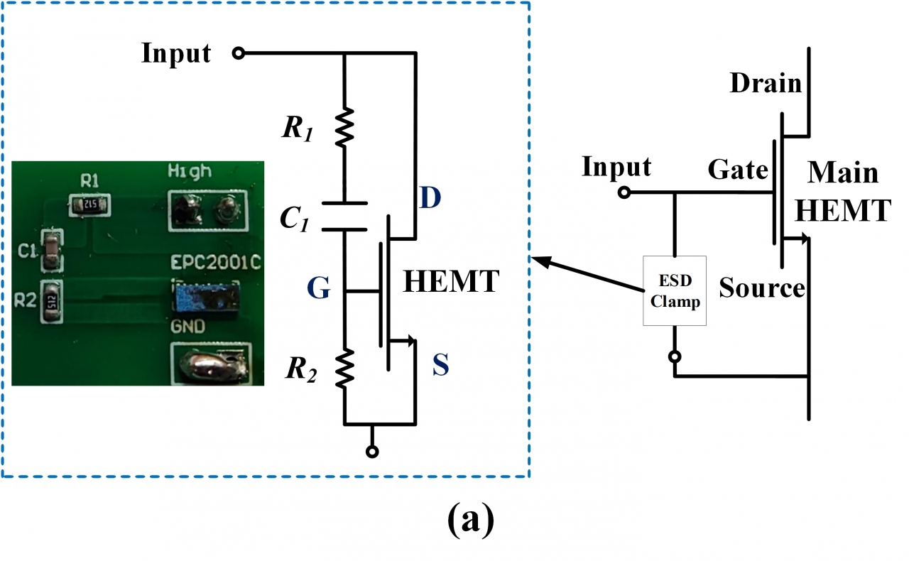 团队通过仿真与实验研究,提出并验证了一种适用于GaN功率器件的RC偏置ESD电路。该电路具有低静态漏电及高泄放效率。RC偏置的ESD电路以GaN p-GaN HEMT作为泄放器件,通过电容与电阻串联偏置控制泄放器件的导通及关断。RC偏置的ESD电路的创新机理为:其一,通过在偏置电路中引入电容,可有效降低ESD电路开启前的静态漏电,降低功耗同时避免对被保护器件的影响;其二,正向ESD动态脉冲条件下,随着电容的充放电,其电阻不再是无穷大。电容与偏置电路中电阻分压使得泄放器件p-GaN HEMT开启,从而实现电流泄放,将电压钳位到安全水平;其三,反向ESD动态脉冲条件下,通过相似原理实现双向ESD保护。