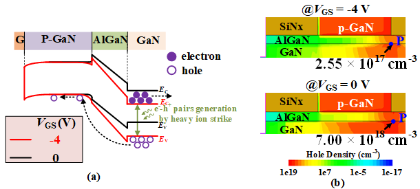 图4 栅压为(a) 辐照期间沿栅叠层处的能带示意图。(b) 栅压为-4V和0V时的二维空穴浓度分布图。
