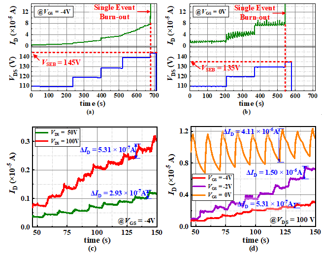 图3 栅压为(a) -4V和(b) 0V时的单粒子烧毁特性。(c)不同漏极电压与(d)不同栅极电压下的单粒子瞬态电流曲线对比。
