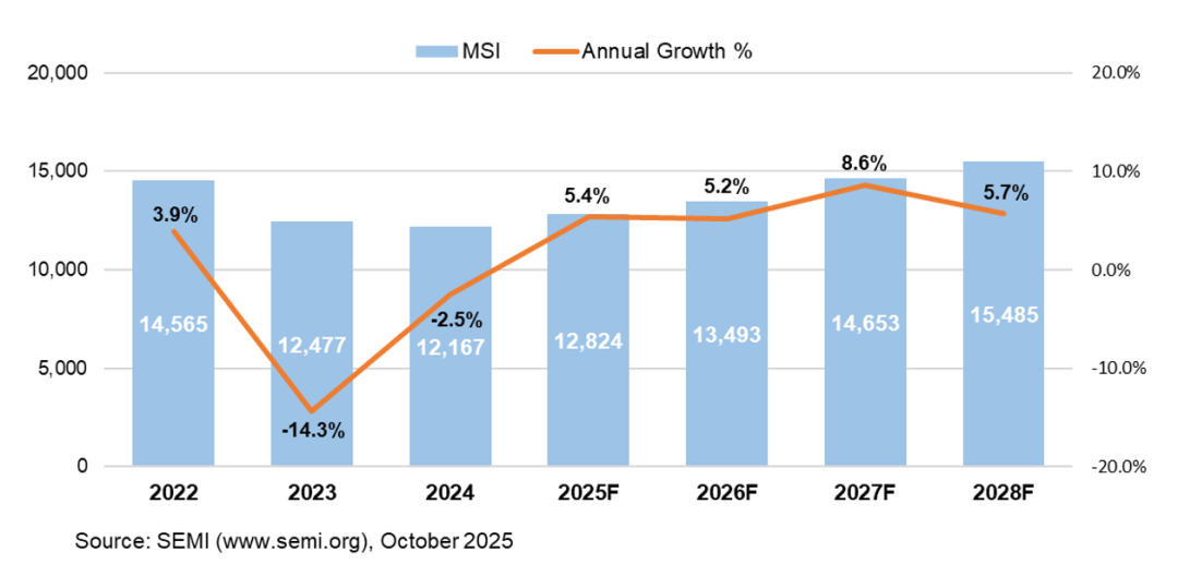 2024年全球半导体硅片市场受行业周期影响呈阶段性调整,销售额约115亿美元,同比下滑6.5%;随着AI芯片、车规半导体等新兴需求爆发,2025年市场规模预计回升至130亿美元,2024-2030年复合增长率约8%。硅片按尺寸可分为6英寸、8英寸和12英寸等;按加工程度可分为抛光片、外延片、SOI片等。12英寸硅片在市场中的地位日益重要。根据SEMI数据,2023年全年销售硅片12477百万平方英寸(MSI),到2028年将增长到15485百万平方英寸(MSI)。中国半导体硅片市场规模增长迅速,且增速高于全球水平。2023 年中国半导体硅片市场规模约占全球的 20.63%,预计 2030 年将达到 58.67 亿美元,届时全球占比将提升至 23.21%。