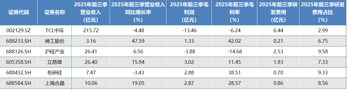 从 2025年前三季数据来看,营业总收入前三的企业为 TCL 中环、沪硅产业和立昂微,分别达到215.72亿元( TCL 中环的半导体硅片营收约为42.4亿元)、26.41 亿元和26.40 亿元。这些头部企业凭借长期的技术积累、大规模的生产能力和广泛的客户群体,形成了较高的规模壁垒。例如 TCL 中环在光伏和半导体硅片领域均有布局,大规模的生产使得其在成本控制和市场份额获取上具有优势。营业总收入同比增长前三的企业为神工股份、上海合晶和立昂微,同比增长率分别为47.59%、19.05%和 15.94%。神工股份的高增长可能得益于产品放量,其在半导体硅材料细分领域的产品得到市场认可,市场需求增加带动了营收的快速增长。