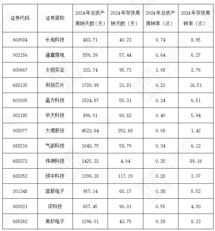 2025年前三季度数据显示,总资产周转天数最短的前三企业分别是长电科技(前三季度平均约510天)、通富微电(前三季度平均约570天)、深科技(前三季度平均约680天);最长的前三企业分别是大港股份(前三季度平均约4800天)、利扬芯片(前三季度平均约1600天)、晶方科技(前三季度平均约1300天)。长电科技和通富微电作为行业内规模较大的企业,资产规模大且资产结构相对合理,设备利用率高,业务多元化且市场份额稳定,订单充足,能有效利用资产创造收入,所以总资产运营效率较高。