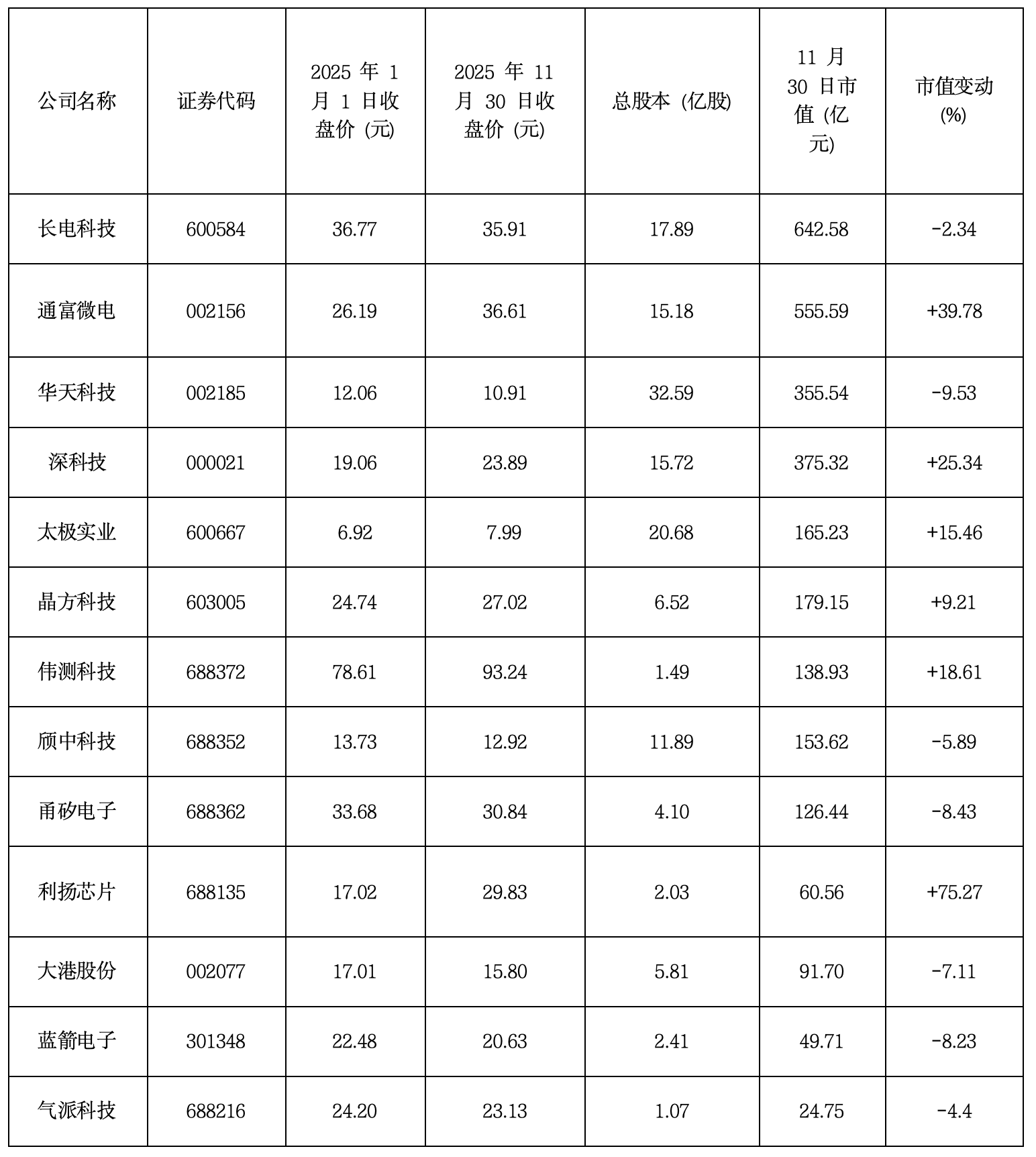 2025年,封测行业股价波动分化明显,截止11月30日,涨幅前三名是利扬芯片(75.27%)、通富微电(39.78%)、深科技(25.34%),主要受益于AI芯片测试需求增长和先进封装技术突破。市值最高的前三名企业是长电科技(642.58亿元)、通富微电(555.59亿元)、华天科技(355.54亿元)。