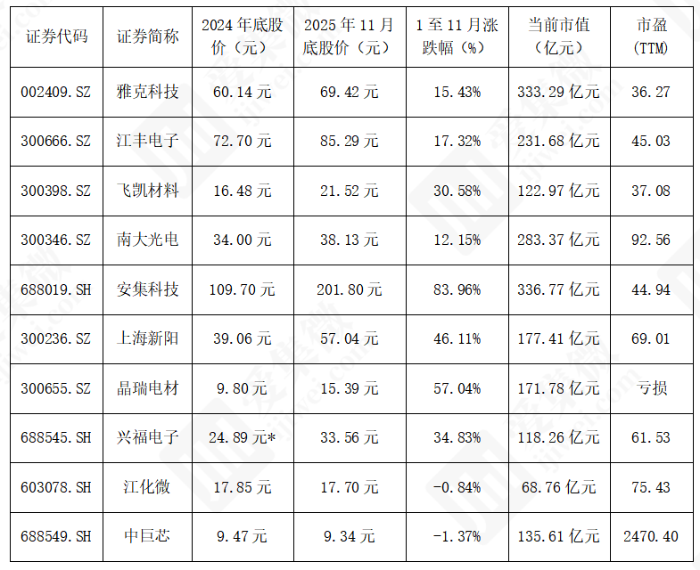 2025 年 1-11 月,十家企业股价涨幅差距明显。安集科技(83.96%)、晶瑞电材(57.04%)涨幅居前,核心受益于业绩爆发与行业红利;上海新阳(46.11%)、兴福电子(34.83%)依托业务突破实现稳健上涨;雅克科技、江丰电子等涨幅温和,受业务基本面与资金波动影响呈现震荡走势;江化微(-0.84%)、中巨芯(-1.37%)小幅下跌,分别受市场竞争与盈利规模制约。