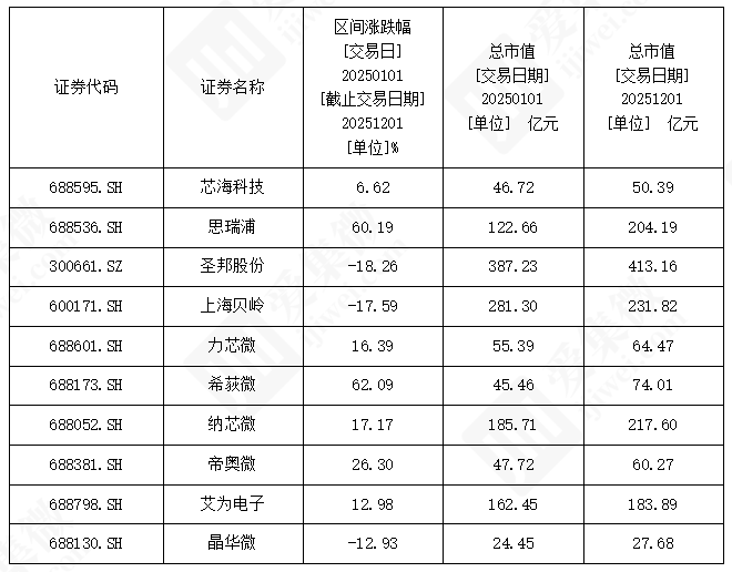 2025 年1月 - 12月,企业市场表现分化:思瑞浦、希荻微区间涨幅超 60%,市值分别跃升至 204.19 亿元、74.01 亿元,市场热度显著;帝奥微(26.30%)、纳芯微(17.17%)等涨幅居前,市值同步扩张。整体看,高涨幅企业获资金青睐,而调整中的头部企业市值韧性分化,市场对企业成长预期的差异主导了本轮表现。