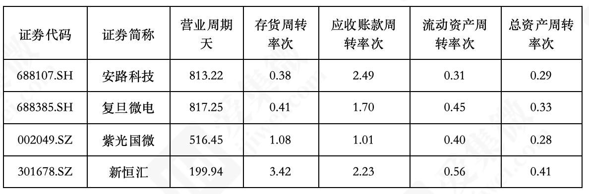 从整体资产周转效率看,四家企业呈现 “中小企更优、头部分化” 格局,流动资产周转率与总资产周转率的差异,深刻反映企业资产利用效率与业务模式的关联性。新恒汇以 0.56 次流动资产周转率、0.41 次总资产周转率双高领跑,两项指标均显著高于其他企业,核心因其一贯聚焦智能安全芯片封装测试业务 —— 该业务属于轻资产模式,流动资产(如存货、应收账款)占比高且周转速度快,无需大规模固定资产投入,资产整体运营效率自然领先,凸显中小半导体企业在细分轻资产赛道的运营优势。