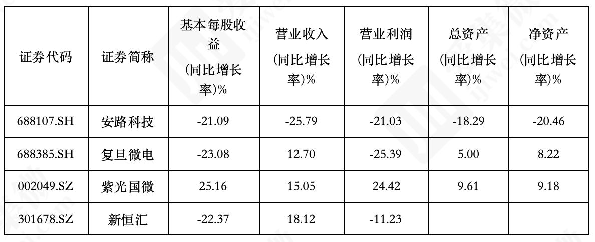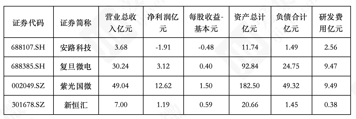 中国半导体上市公司数据方面,《报告》以安路科技、复旦微电、紫光国微、新恒汇这4家上市企业为样本,构建了全方位对标体系。