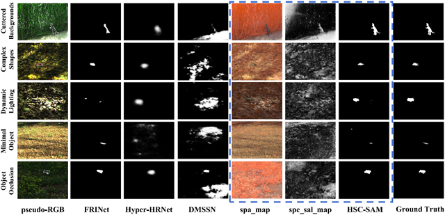 如图3所示,在复杂且具有显著视觉干扰的场景中,HSC-SAM能够准确定位空间上高度伪装、但在光谱维度具有显著差异的目标区域。与现有方法相比,HSC-SAM的目标定位结果呈现出更清晰的目标边界、更高的轮廓保真度,充分证明了其在伪装目标检测任务中的优异性能。